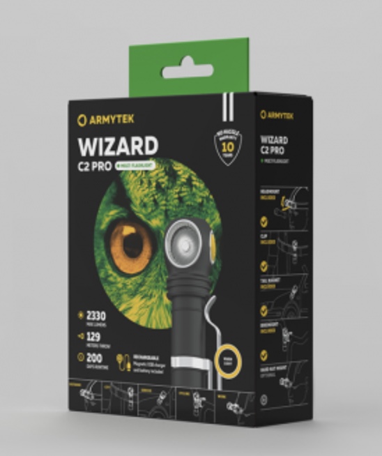 В комплект входит комфортное налобное крепление, клипса для фиксации на одежде или рюкзаке и велокрепление ABM-01. Wizard C2 Pro совместим с креплением на каску AHM-02 и подходит для строительных работ.