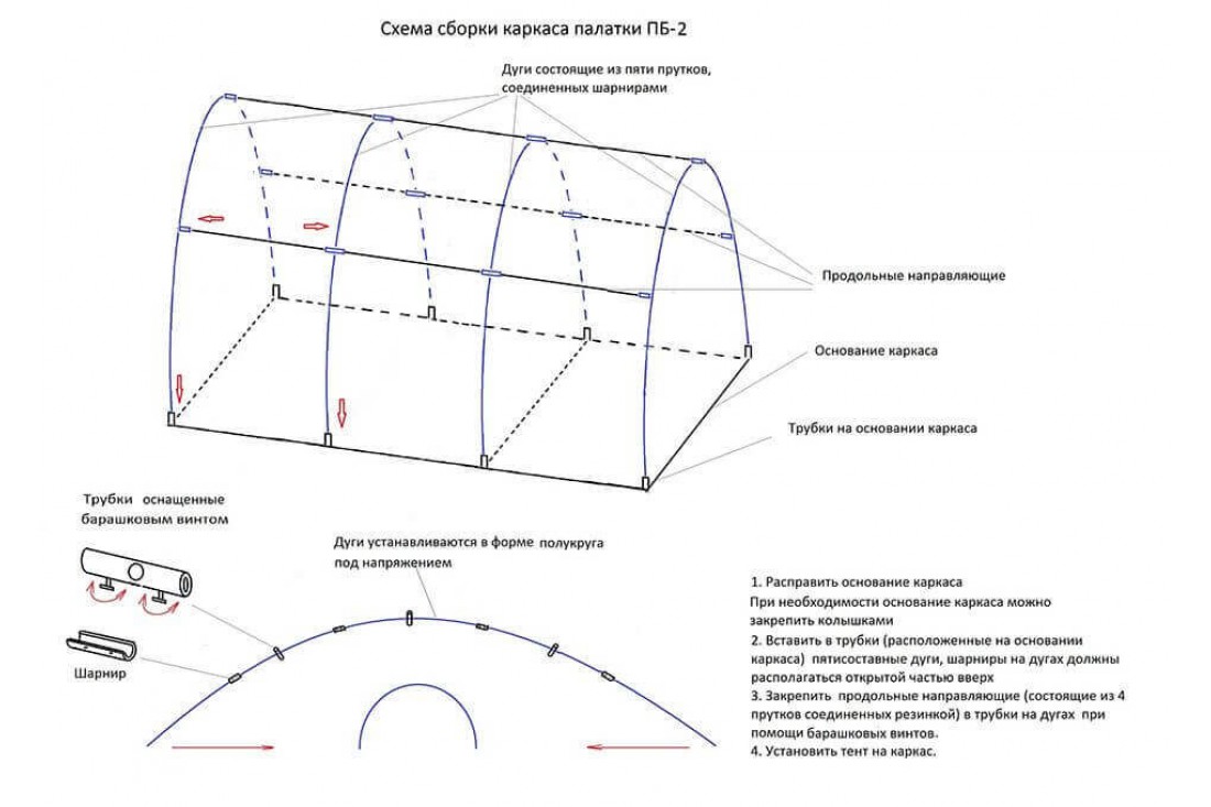 В трубки, расположенные в основании каркаса, вставьте складные дуги. Шарниры на дугах устанавливаются открытой частью вверх;