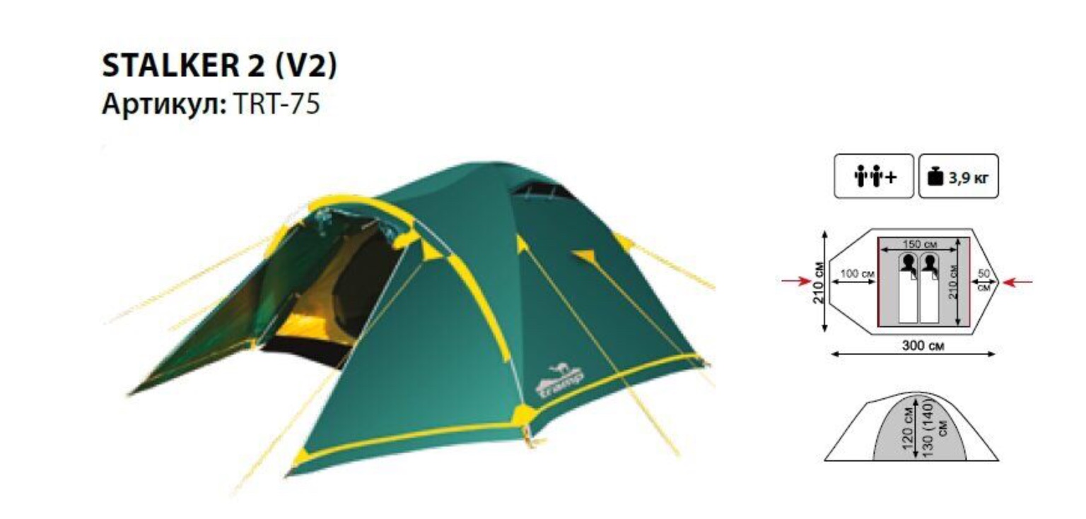 Короткое описание Универсальная палатка Tramp Stalker 2 V2. Трехдуговая модель конструкции "полусфера" с просторным тамбуром, двум входами и снежной юбкой по периметру внешнего тента.