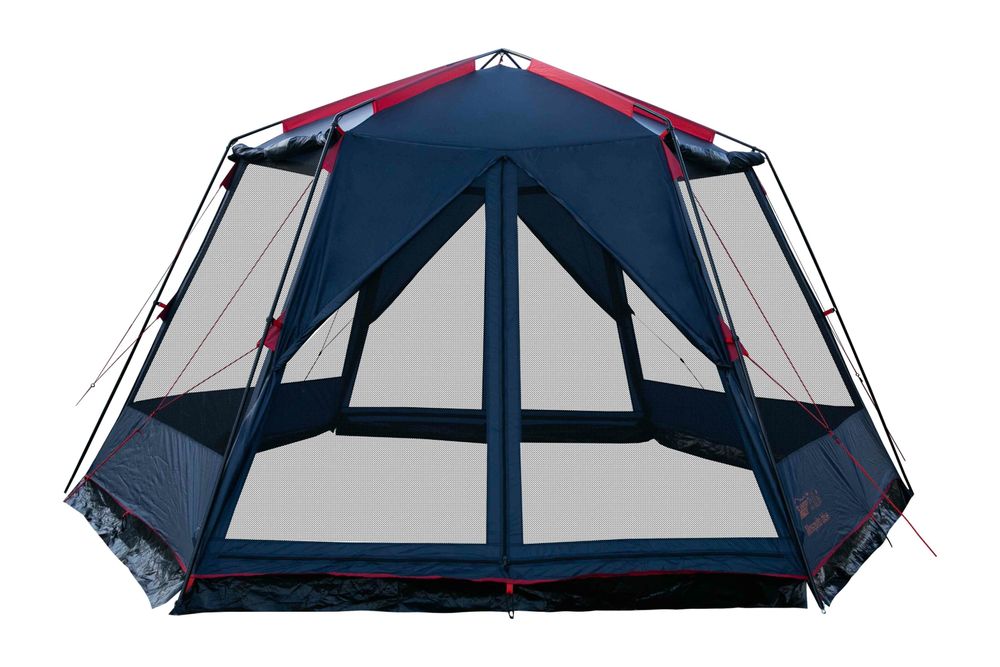 Короткое описание Облегченный кемпинговый тент-шатер шестигранной формы на прочном стальном каркасе со стенками из противомоскитной сетки для организации, кухни, столовой или кают –кампании в кемпинговом или туристическом лагере.