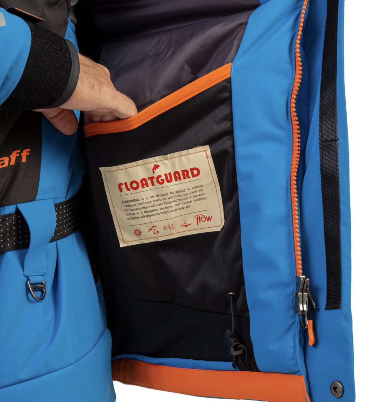 FLOAT GUARD обладает уникальным выталкивающим свойством в воде, благодаря многослойному пенополиуретану, который дает возможность использования его в чрезвычайных ситуациях на воде. Структура пены - это миллионы пузырьков, которые соединяют свободные районы теплого воздуха для защиты от холода, уменьшая риск гипотермии. Кроме того, для повышения безопасности пользователей во время рыбалки, костюм имеет светоотражающие элементы. Сочетание светоотражающих элементов с красным цветом способствует лучшей видимости рыболова на снегу и в воде. При непредвиденном попадании в воду, костюм продержит вас на поверхности такое количество времени, которое необходимо для самостоятельного спасения или оказания вам помощи. В отличии от классических костюмов-поплавков, данный костюм является раздельным, что увеличивает комфортность его использования.