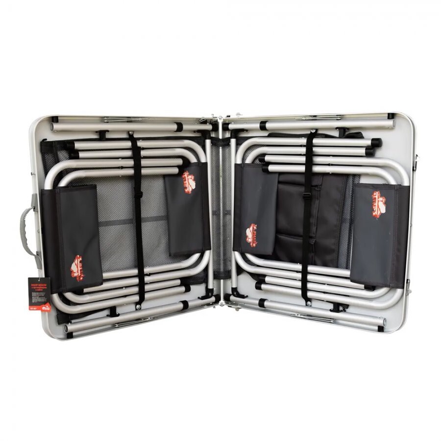 - Стулья крепятся ко внутренней стороне стола, стол складывается пополам как чемоданчик;