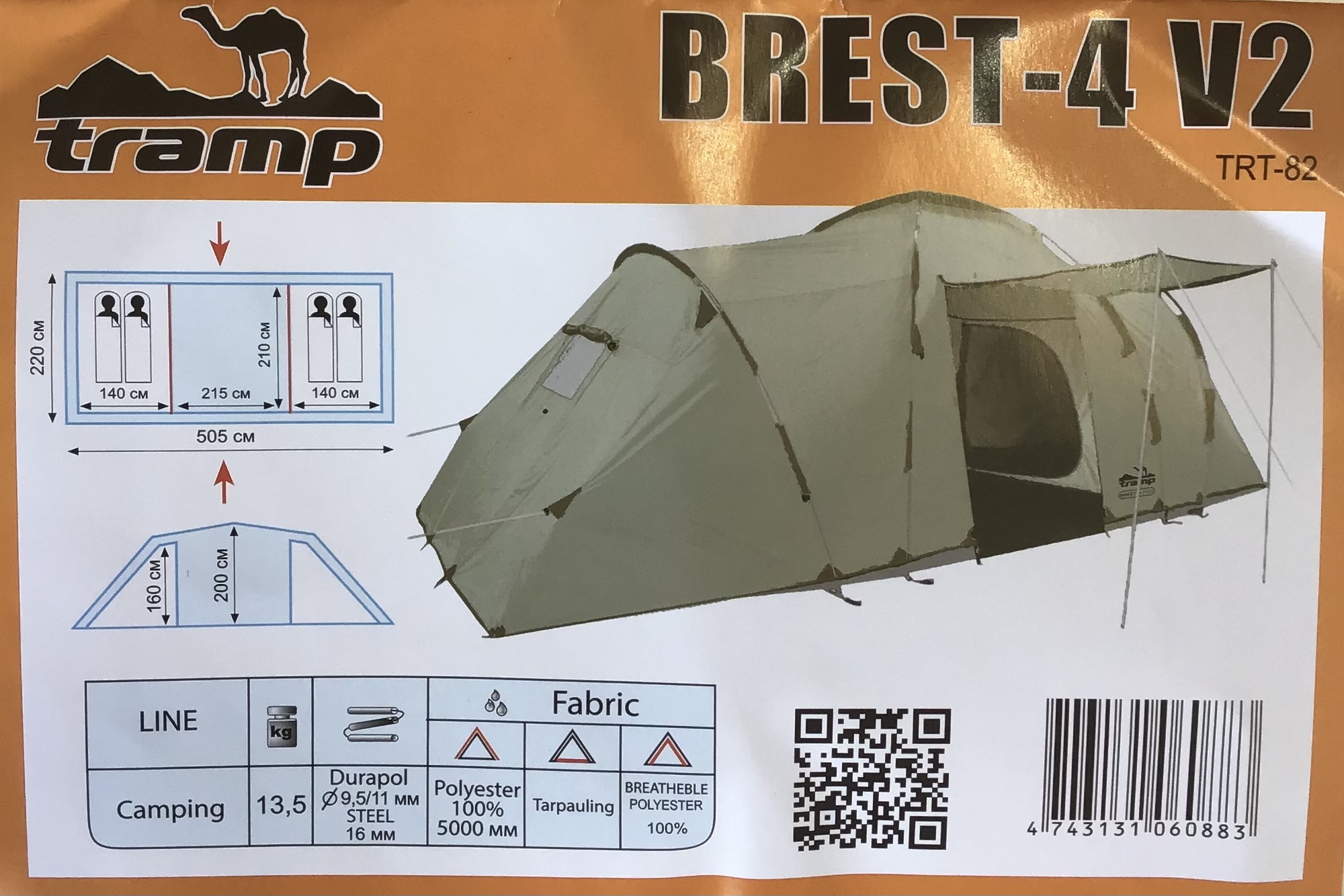 Палатка Tramp Brest 4 (V2) по конструкции и характеристикам относится к кемпинговому типу. Идеально подойдет для большой семьи или компании отдыхающих. Вместимость составляет до четырех человек. Конструкция представляет собой два отдельных спальных места, между которыми размещен тамбур для вещей. В тамбуре также можно укрыться от дождя и ветра или установить обеденный стол. При необходимости, там можно спать. Двухслойный материал надежно защищает от ветра и дождя. Благодаря покрытию, на стенках не образуется конденсат. Цвет не будет выгорать на солнце. Размеры палатки позволяют свободно перемещаться в ней взрослому человеку. Внутри присутствуют сетчатые карманы для вещей. Конструкция изготовлена из надежного материала, которая практически не деформируется. Благодаря оттяжкам, сооружение надежно крепиться и устойчиво при любых изменениях погоды. Наверху палатки содержится клапан. В жаркую погоду, можно одним касанием убрать дверь и оставить одну москитную сетку. В наличии присутствует ремонтный комплект. В случае повреждения, материал восстановить можно своими руками. Палатку рекомендуется использовать осенью, летом и весной.