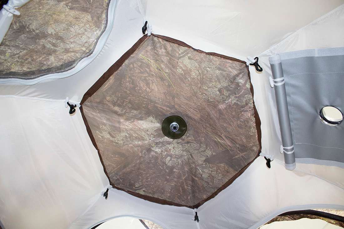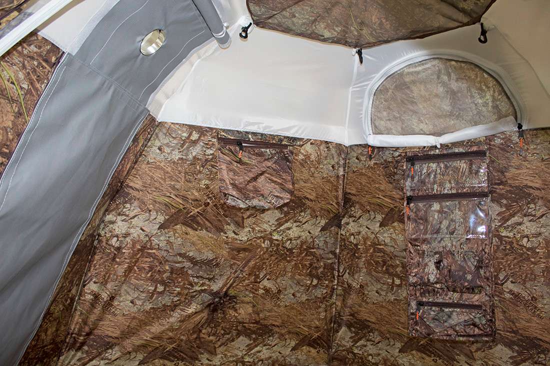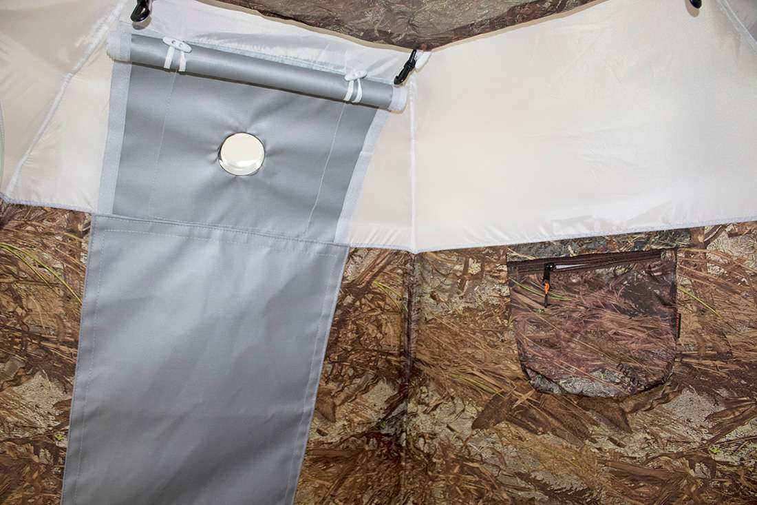 Оба тента крепятся к каркасу липами, поэтому зимнюю палатку можно легко превратить в однослойную летнюю. Дно полностью отстегивается.