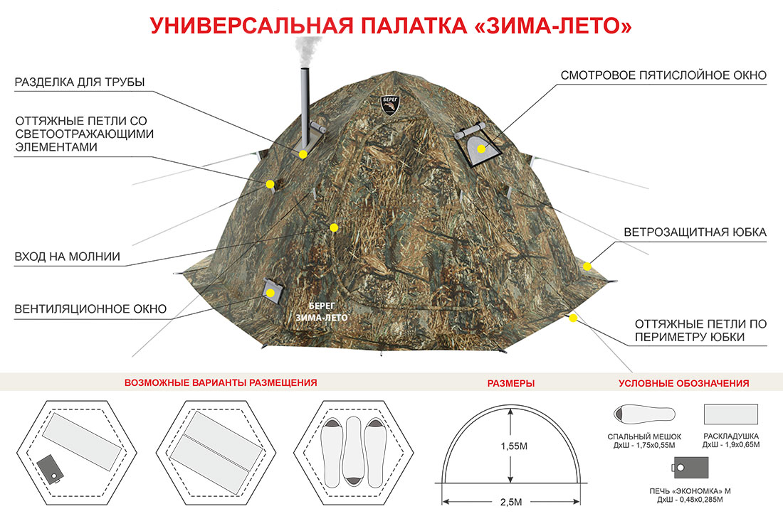Зима-лето состоит из двух водостойких тентов и прочного алюминиевого каркаса.