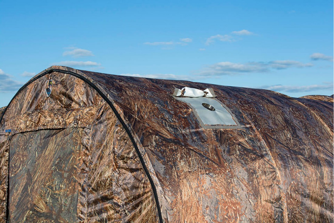 Конструкцией тамбура предусмотрена возможность отдельной и независимой установки от палатки УП. Наличие дополнительной разделки дымохода делает возможным использование его в качестве походной бани, кухни или карповой палатки.