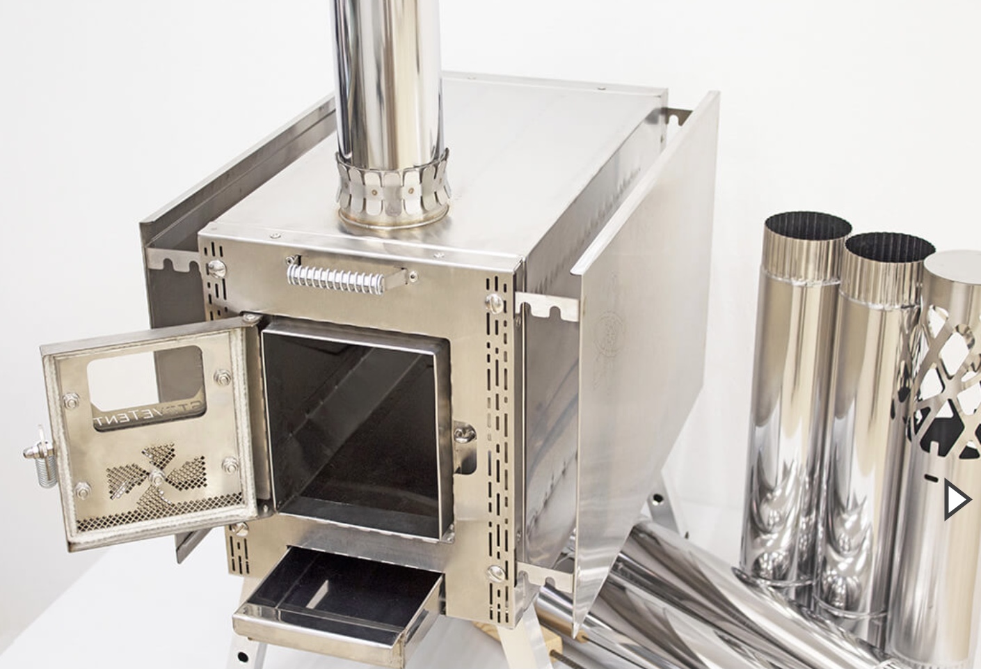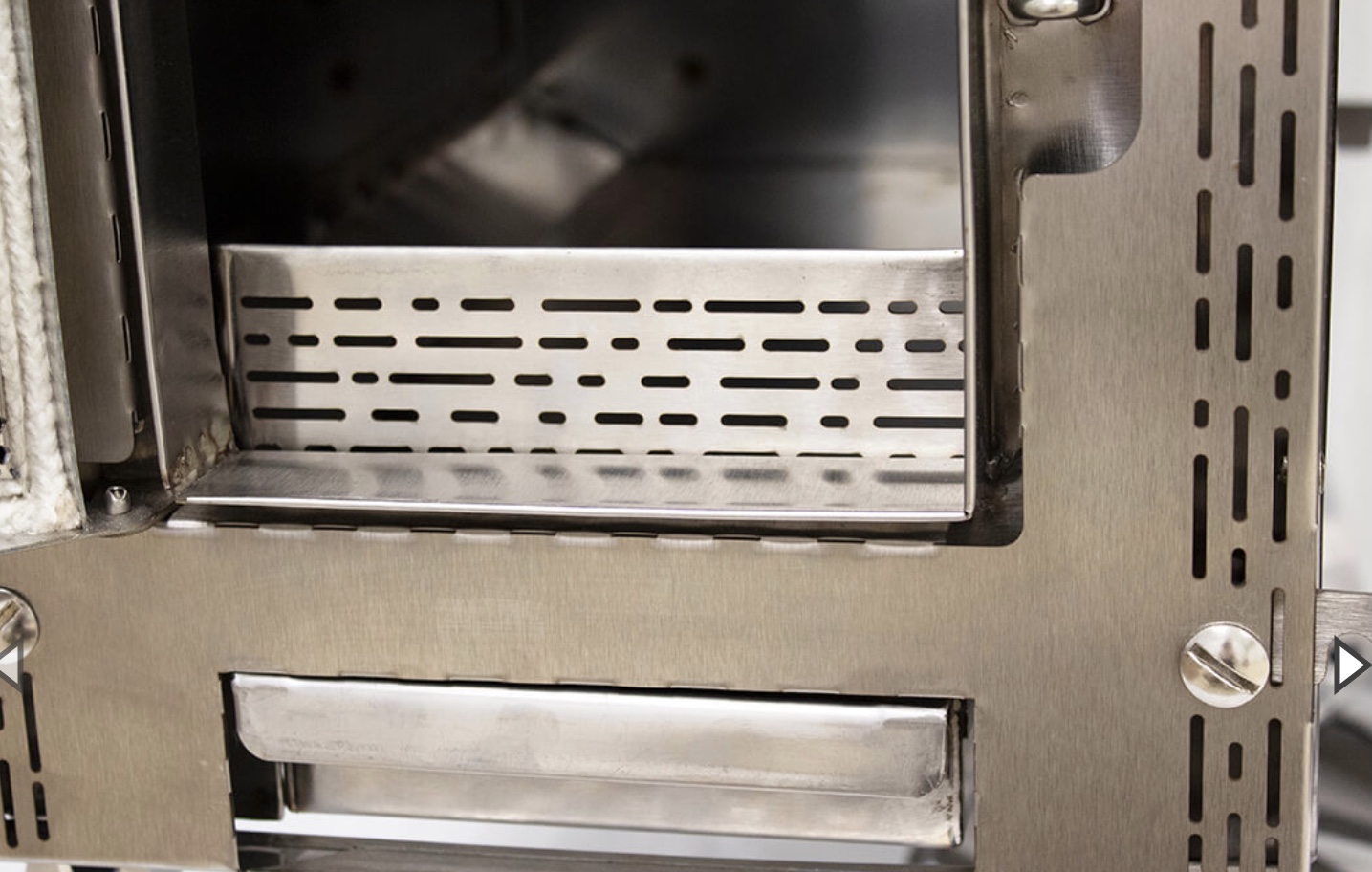 В конструкции печки есть поддон из пищевой нержавеющей стали. Используйте его для приготовления пищи, а также хранения и перевозки ножек. Открывайте его при подкидывании дров, чтобы избежать попадания искр и углей на пол палатки. Колосниковая решетка в конструкции не предусмотрена.