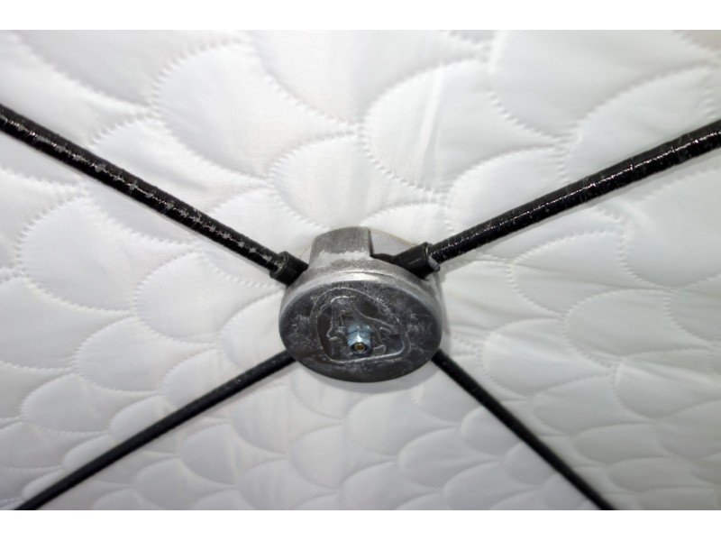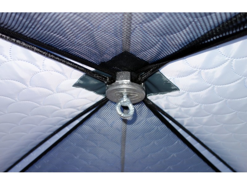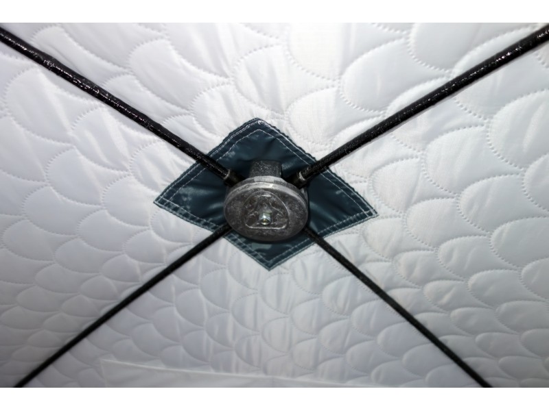 - При креплении укрытия на льду распределять растяжки симметрично по всему периметру, что поможет избежать перекоса и чрезмерной нагрузки на молнию входной двери.