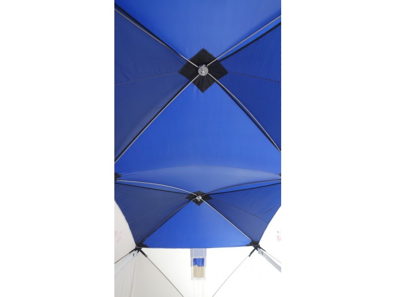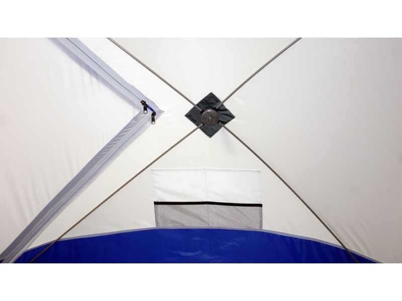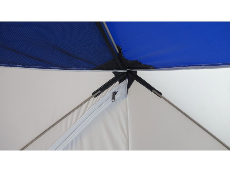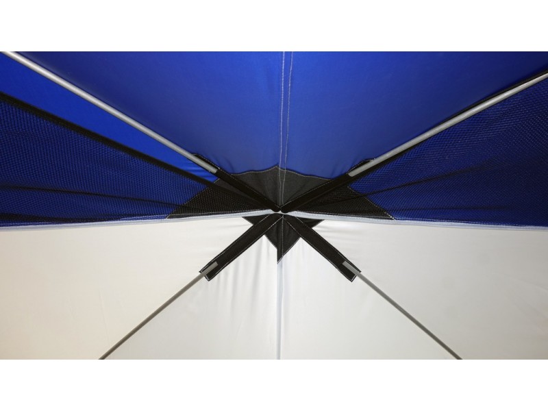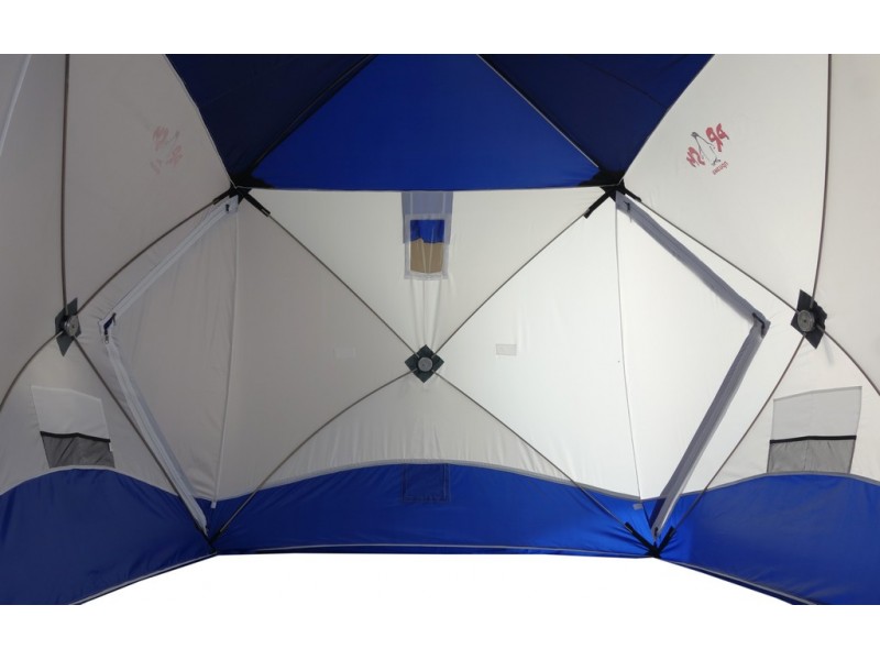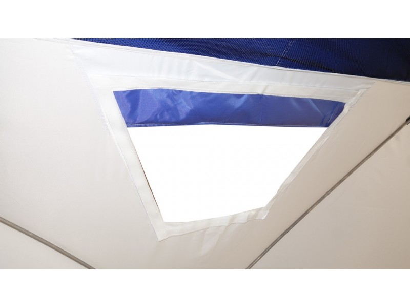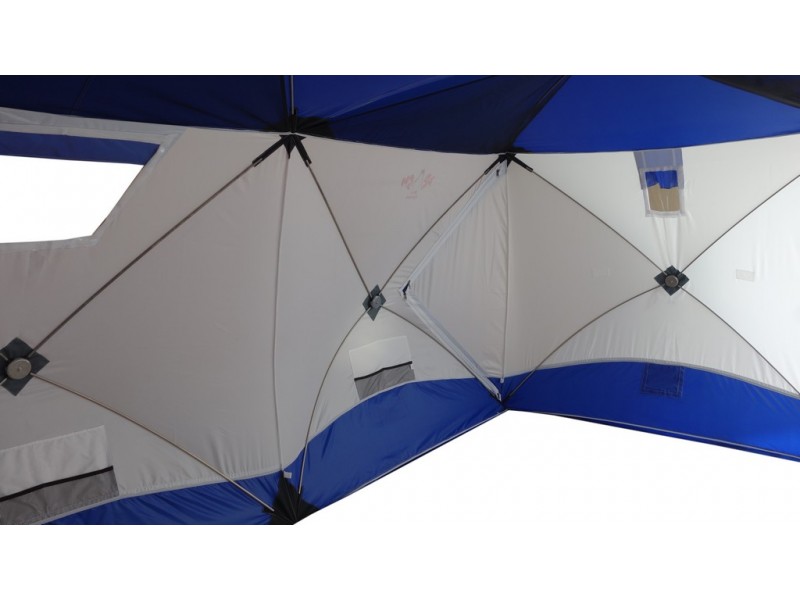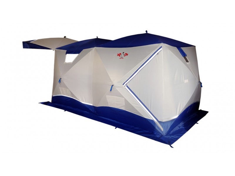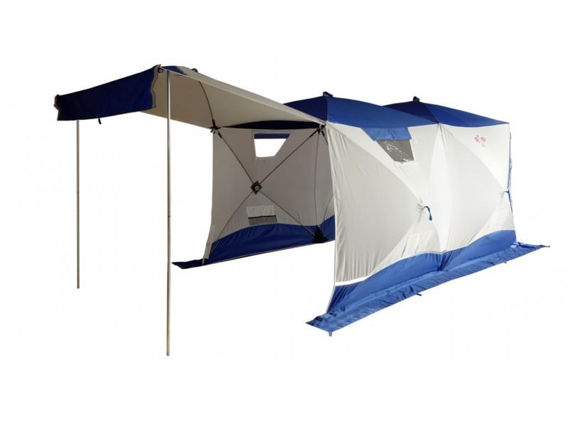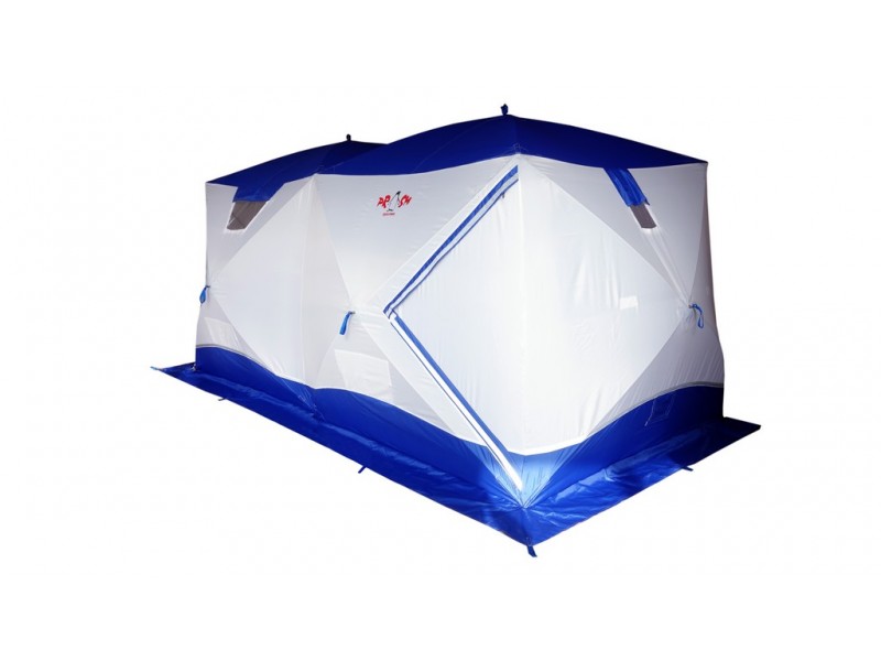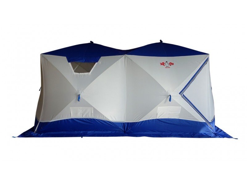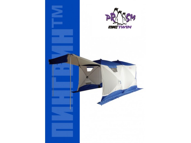 Всесезонная палатка Призма Шелтерс "BIG TWIN" (1-сл.) - новинка сезона! Имеет форму двойного куба, что позволяет организовать базовый лагерь от 4-х человек и при этом рационально использовать пространство. "Big Twin" - это не только укрытие для рыбаков. Благодаря конструкции "Шелтерс", одна из сторон поднимается и становится крышей, тем самым модифицируя палатку в шатер. Летом, установив палатку на берегу водоема, вы находитесь в укрытии и в то же время имеете открытый доступ к воде и абсолютно свободно работаете со снастями. В то же время вещи, прикормка, насадка, снасти - всё находится рядом в укрытии. Размеры "Big Twin" позволяют комфортно расположить вещи и с удобством разместиться самим. Зимой сверлить лунки можно непосредственно в установленной палатке. Несмотря на свои размеры, палатка выдерживает порывистый ветер. Легко ставится в любую погоду. Для удобства в палатке также сделано два входа. Входы сделаны напротив друг друга, что позволяет оптимизировать внутреннее пространство (при этом открывающая сторона находится напротив дверей). Входы с фиксатором – липучкой выполнены в угловом варианте и снабжены специальной зимней молнией, которая снаружи имеет защитную планку, предотвращающую от замерзания. На наружной юбке имеются оттяжки для крепления порогов при отсутствии снега. Тент кроме поднимающейся стороны и двух входов имеет: 3 форточки, выполненных из прозрачной морозостойкой ПВХ-плёнки (одна полностью съёмная), 4 настрочных кармана с сеткой, 4 потолочных кармана-сетки, выход под трубу на липе. Основной цвет белый с цветной крышей и порогами. Снаружи имеются светоотражающие элементы, что очень важно для безопасности на льду в темное время суток.