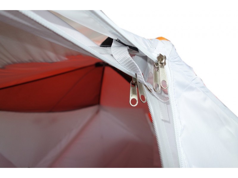 5. Закрепить укрытие на все имеющиеся растяжки на льду и присыпать пороги тента снегом. Застежка-молния должна закрываться и открываться без усилий. Если этого сделать не удаётся, то необходимо: