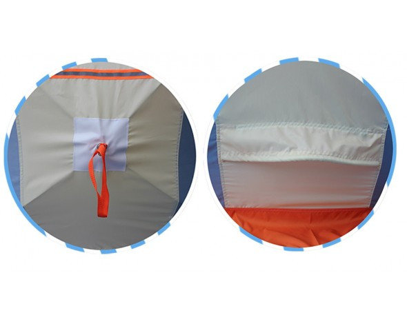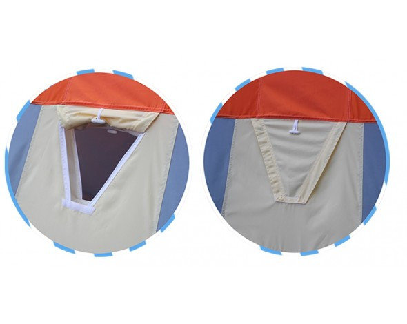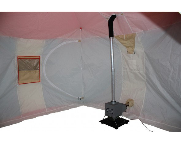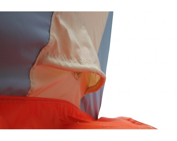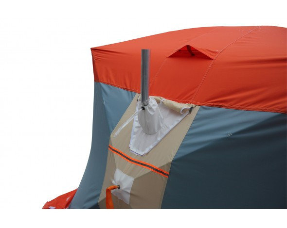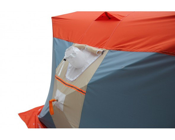Палатка имеет два удобных входа с двух противоположных сторон дающих возможность удобного размещения нескольких человек. Сочетание трех регулируемых вентиляционных клапанов с системой защиты от атмосферных осадков, продублированных и на внутреннем тенте, создает возможность регулировки обновления воздуха и удаления избыточной влаги. Расположение клапанов дает возможность размещения теплообменника для обогрева палатки. Два больших окна на противоположных сторонах с двойными съемными морозостойкими пвх пленками, на внутренним и наружном тенте, создают хороший обзор без потери тепла. Палатка укомплектована двумя органайзерами и подвесной полкой, которые можно закрепить на любой из сторон, как на внутреннем, так и на внешнем тенте.