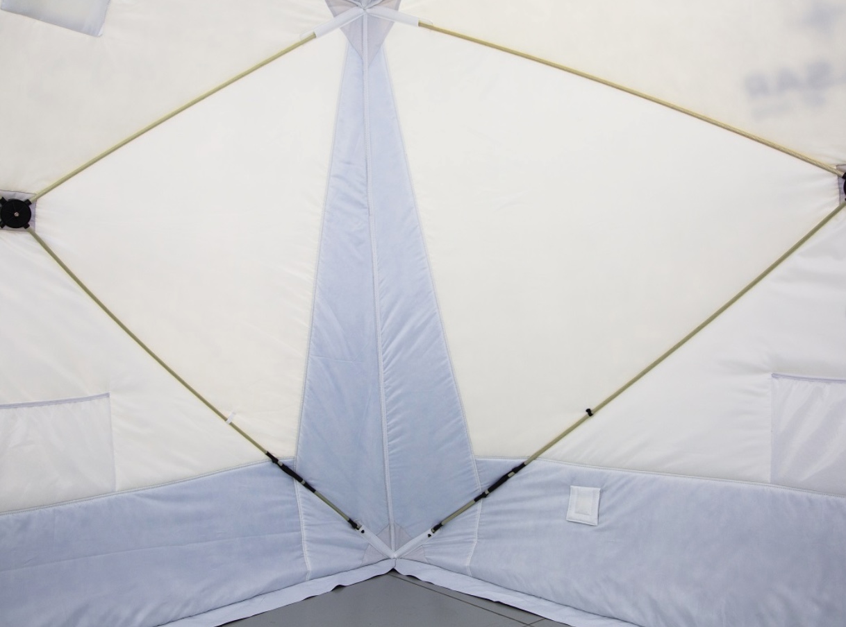- Надежный трехслойный тент с воздушной прослойкой без дополнительной стежки и клея, что обеспечивает высокую сохранность тепла внутри палатки;
