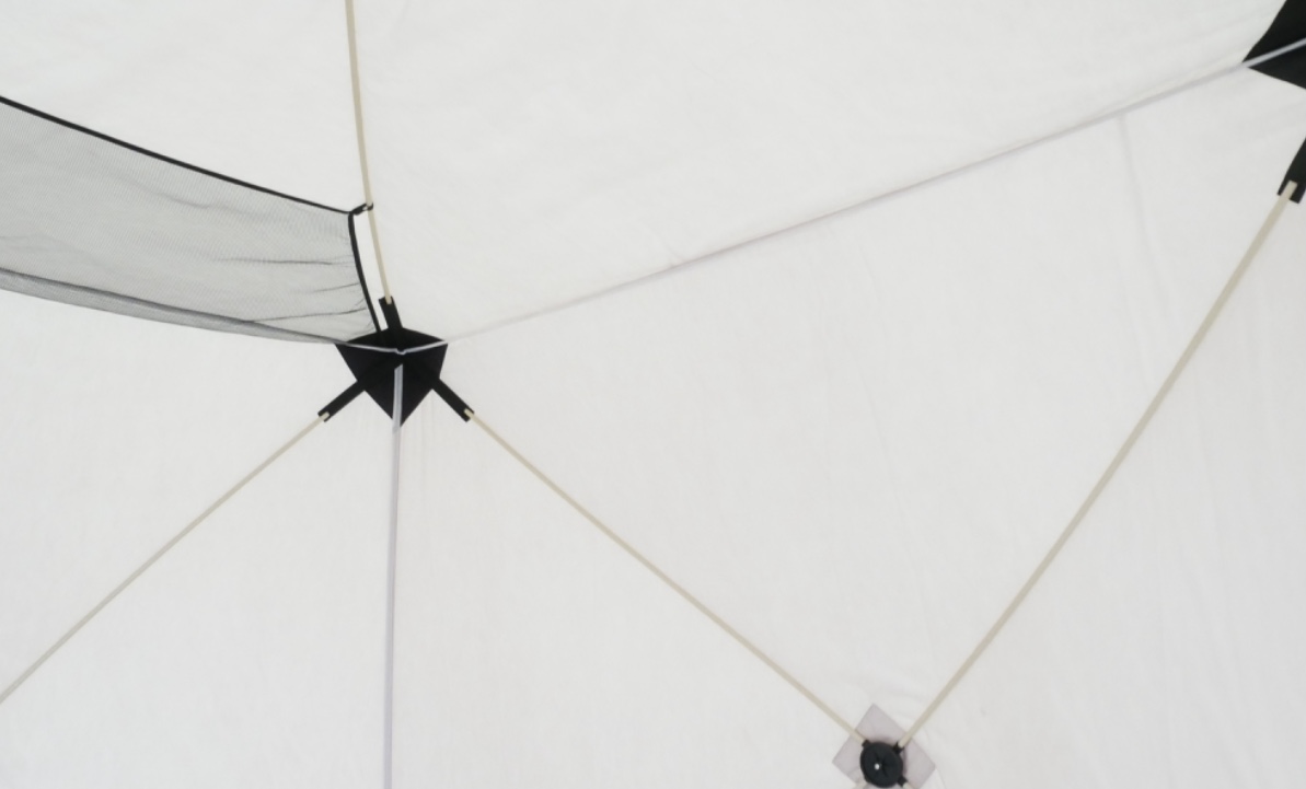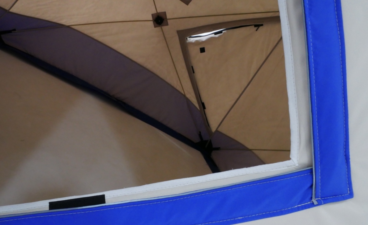 Палатка выполнена в светлых тонах и имеет светоотражающие элементы по периметру, что позволяет увидеть палатку в ночное время. На наружной юбке имеются места крепления ко льду.