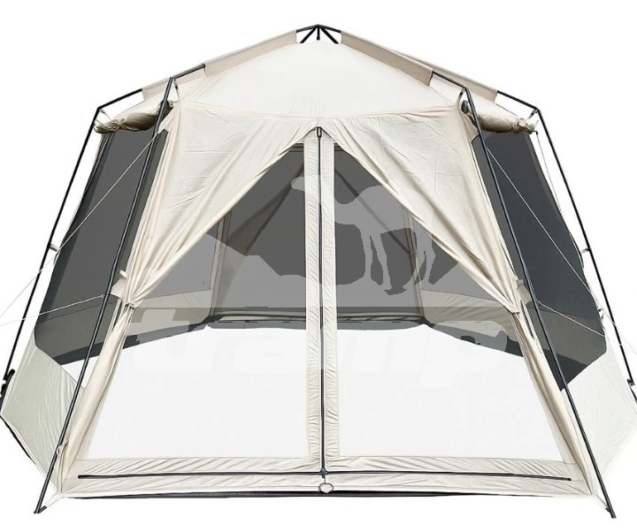 Короткое описание Облегченный кемпинговый тент-шатер шестигранной формы на прочном стальном каркасе со стенками из противомоскитной сетки для организации, кухни, столовой или кают –кампании в кемпинговом или туристическом лагере.