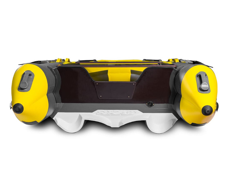 Торцевая часть надувного дна низкого давления была модернизирована путем применения стеклопластика, что повышает скоростные характеристики лодки, а также избавляется интерцептор от деформации при транспортировке.