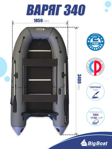 Лодка Varayg 340 является транцевой килевой лодкой с габаритными размерами 3400х1850 мм и диаметром бортовых баллонов 500 мм. Грузоподъемность этой лодки до 500 кг. Лодка состоит из 3 независимых надувных отсеков, которые помогают сохранить плавучесть лодки даже при аварийном проколе 2 из них