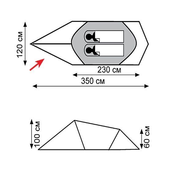Размеры палатки 120 х 230 см — это два полноценных спальных места. Высота 100 см в самом высоком месте.