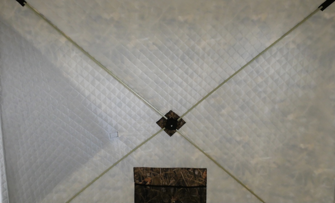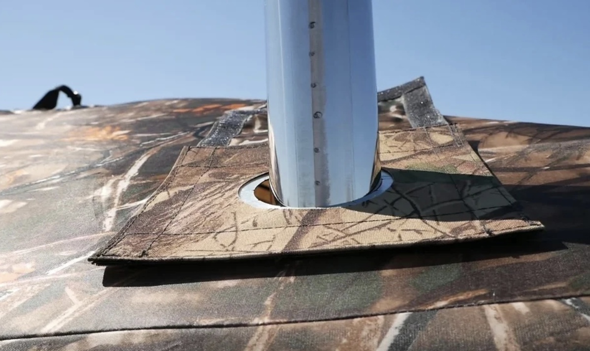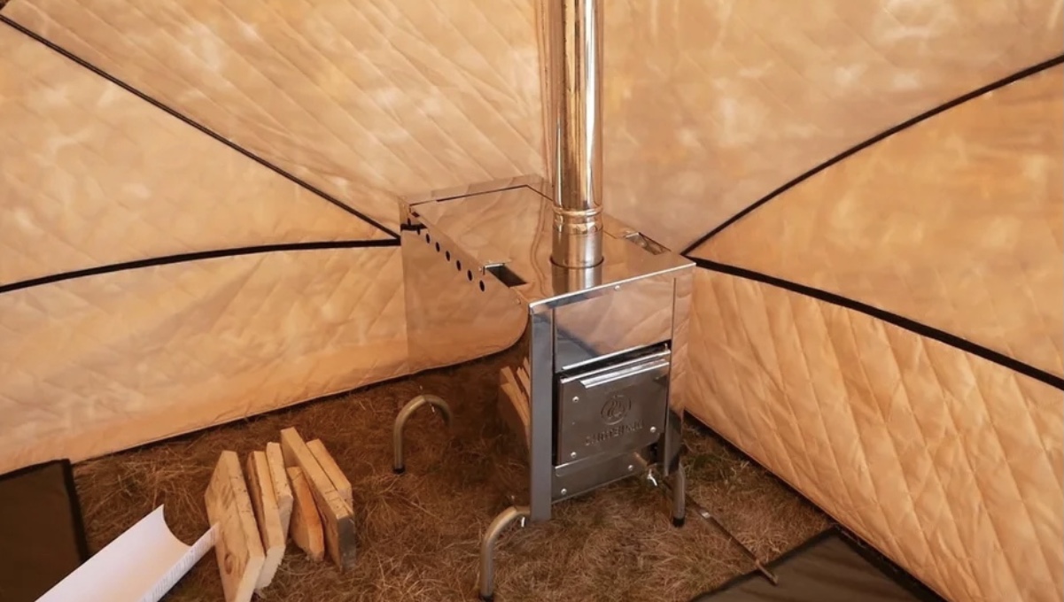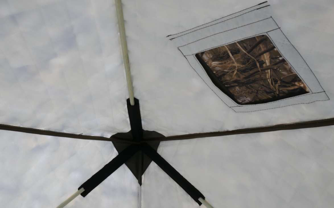 Палатка баня Сибтермо имеет один вход, молния имеет два двусторонних бегунка, расположенных по направлению друг к другу. На входе липа 50 мм, для фиксации двери в открытом положении. Два напротив расположенных окна из съемной ПВХ пленки, с закатывающимся клапаном- козырьком, который в верхнем положении фиксируется при помощи 2-х клевант и петель. По углам порогов и по центрам юбки расположены оттяжки из стропы 20мм., потолочный карман сетка, разделка под трубу на крыше, один сдвоенный карман с сеткой на боковой стенке. На клапане расположена печать логотипа компании Сибтермо. Боковая оттяжка на анкерном болте.